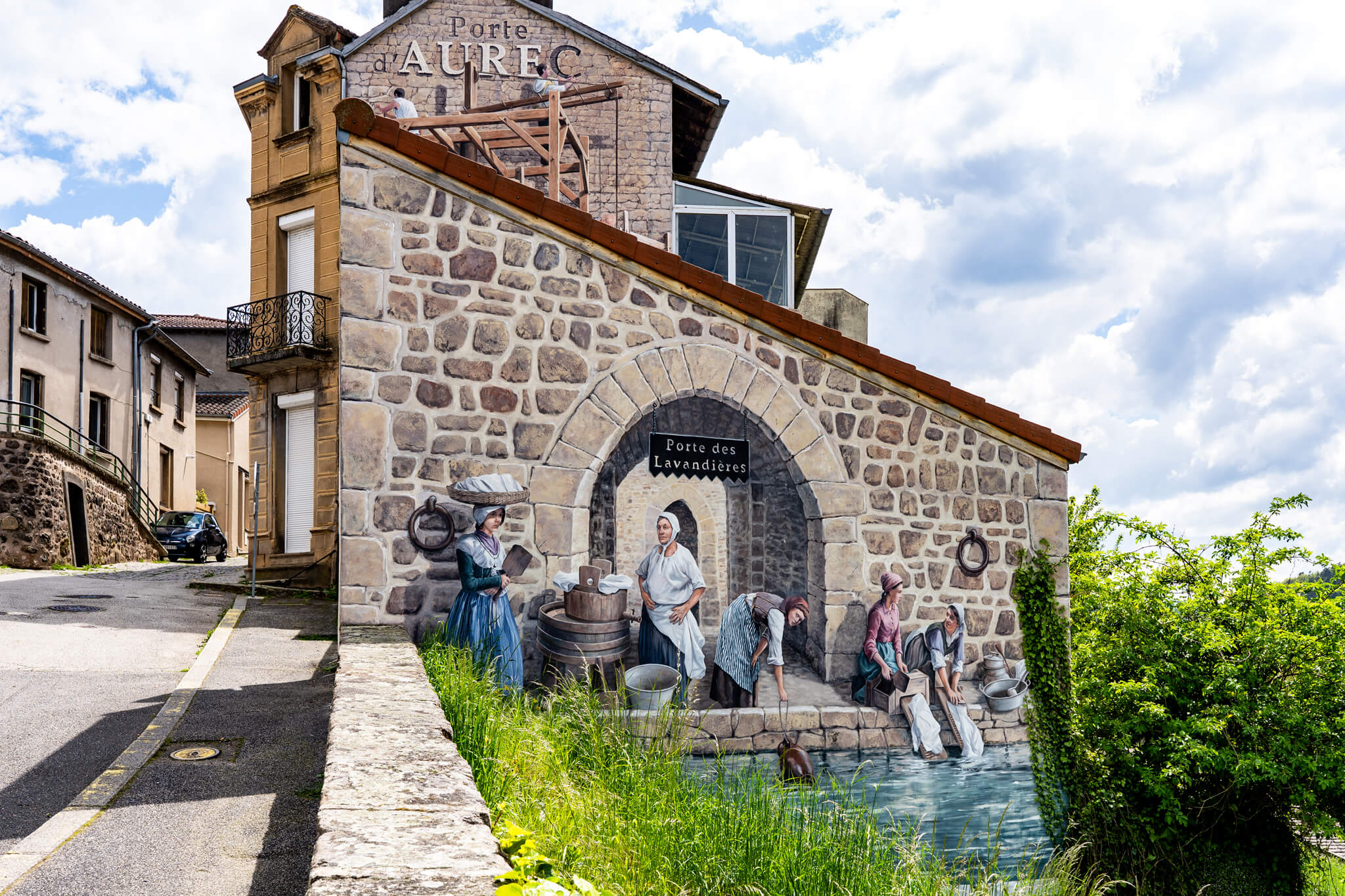Cette fresque représente une scène traditionnelle de la vie aurécoise au Moyen-Âge. Les lavandières descendaient depuis le bourg jusqu'à la Loire pour laver le linge.
